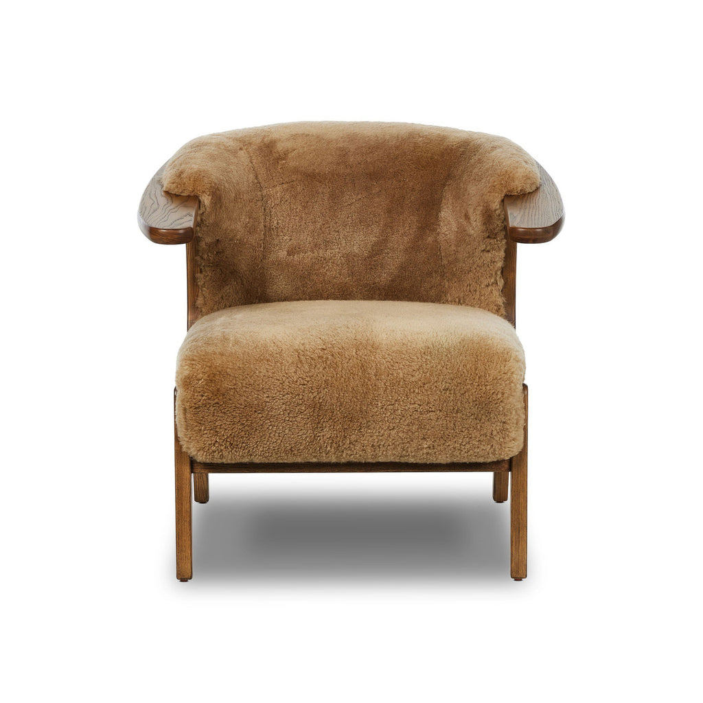 Indulge in total luxury with the Fabian Lounge Chair from Four Hands. Crafted from amber-finished ash cradling soft brown shearling, this chair's subtle paddle arms and wrap-around frame create a warm and inviting seating experience. The S-spring construction ensures a comfortable sit every time. Elevate your living space with the combination of elegant design and exceptional comfort provided by the Fabian Chair.