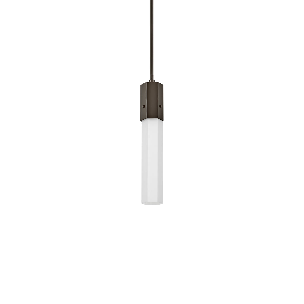 For a profile that is unpretentious, yet unforgettable, view all the sides of Facet. Interesting angles combine with a bold center bracelet to create the edgy and contemporary look. Hexagonal etched glass is highlighted by a Black Oxide or Heritage Brass center and end caps of the same shape, while the hidden mounting hardware remains unseen to simply highlight the superior style.