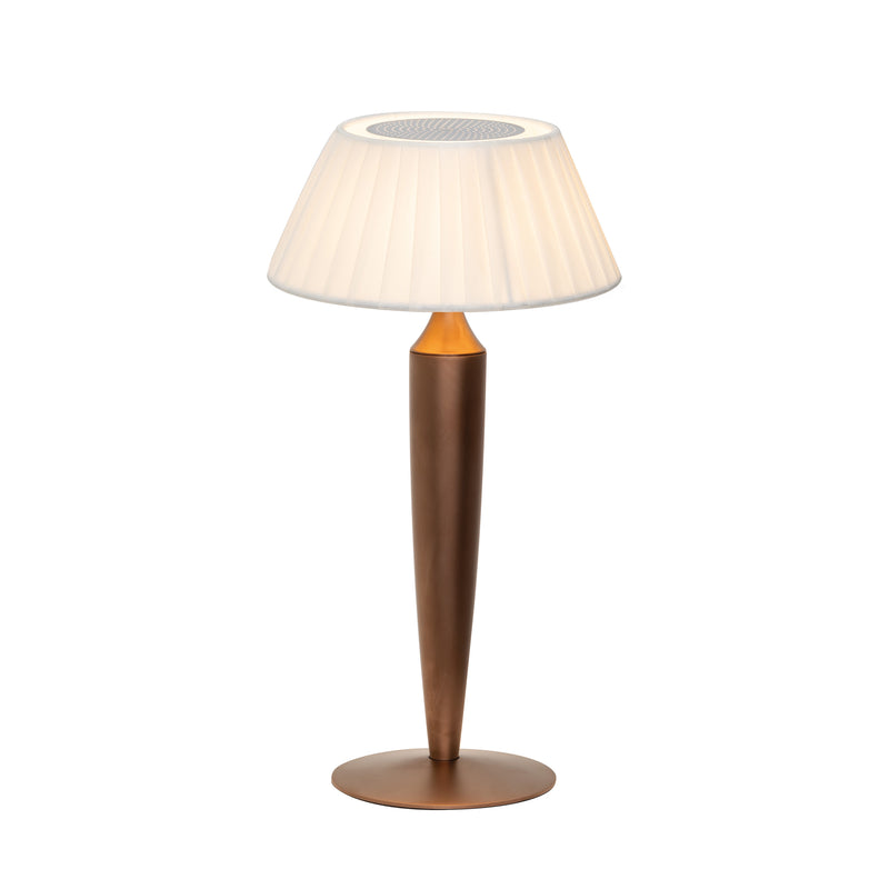 The Flaminia Portable LED Table Lamp from Zafferano blends timeless elegance with modern convenience. Showcasing a classic pleated fabric lampshade and a refined aluminum base, this cordless lamp provides a warm, enveloping glow perfect for creating a cozy atmosphere. An intuitive touch control allows you to dim the brightness and select from three warm color temperatures, effortlessly tailoring the ambiance of any indoor setting with sophisticated, portable style.