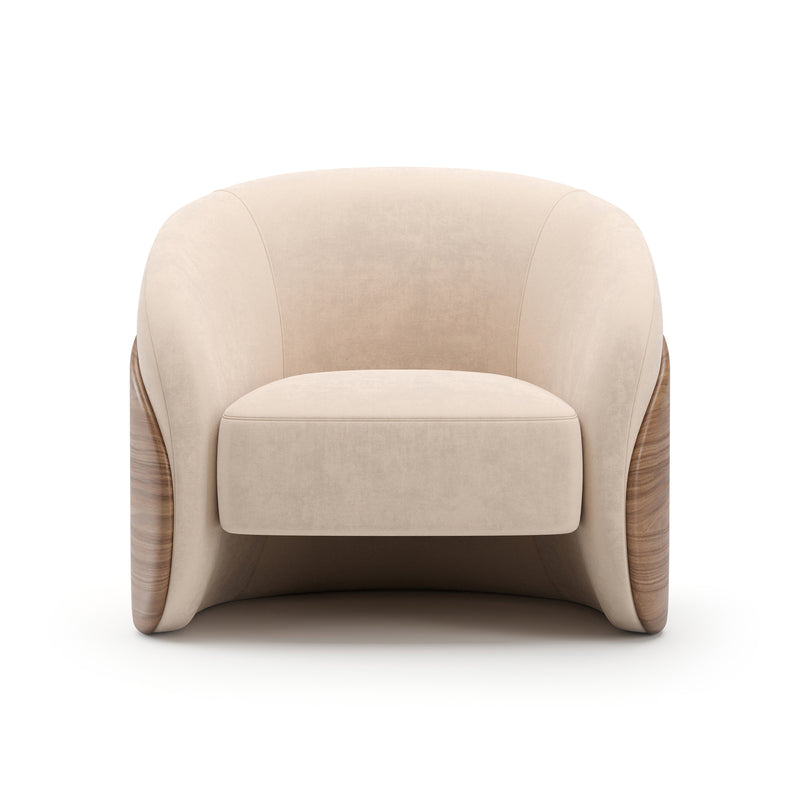 Fleur Wood Back Lounge Chair The Fleur Wood Back Lounge Chair is a sanctuary of comfort, designed with a low-slung profile that invites you to slow down and relax. Its most striking feature is the expansive, wrap-around wood frame finished in a soft Porcini hue, which highlights the natural beauty of the Canaletto walnut while providing a supportive, cradling embrace. The interior is generously upholstered in a premium ivory faux mohair—a rich blend of wool and mohair that offers a subtle sheen and a sophisticated, cloud-like feel. To ensure the seat maintains its shape and comfort over time, it is engineered with a high-resiliency rubber webbing system. Combining the organic warmth of wood with the plushness of high-end textiles, this lounge chair serves as a stunning standalone accent piece that brings a sense of serene, modern luxury to any living space or master suite.