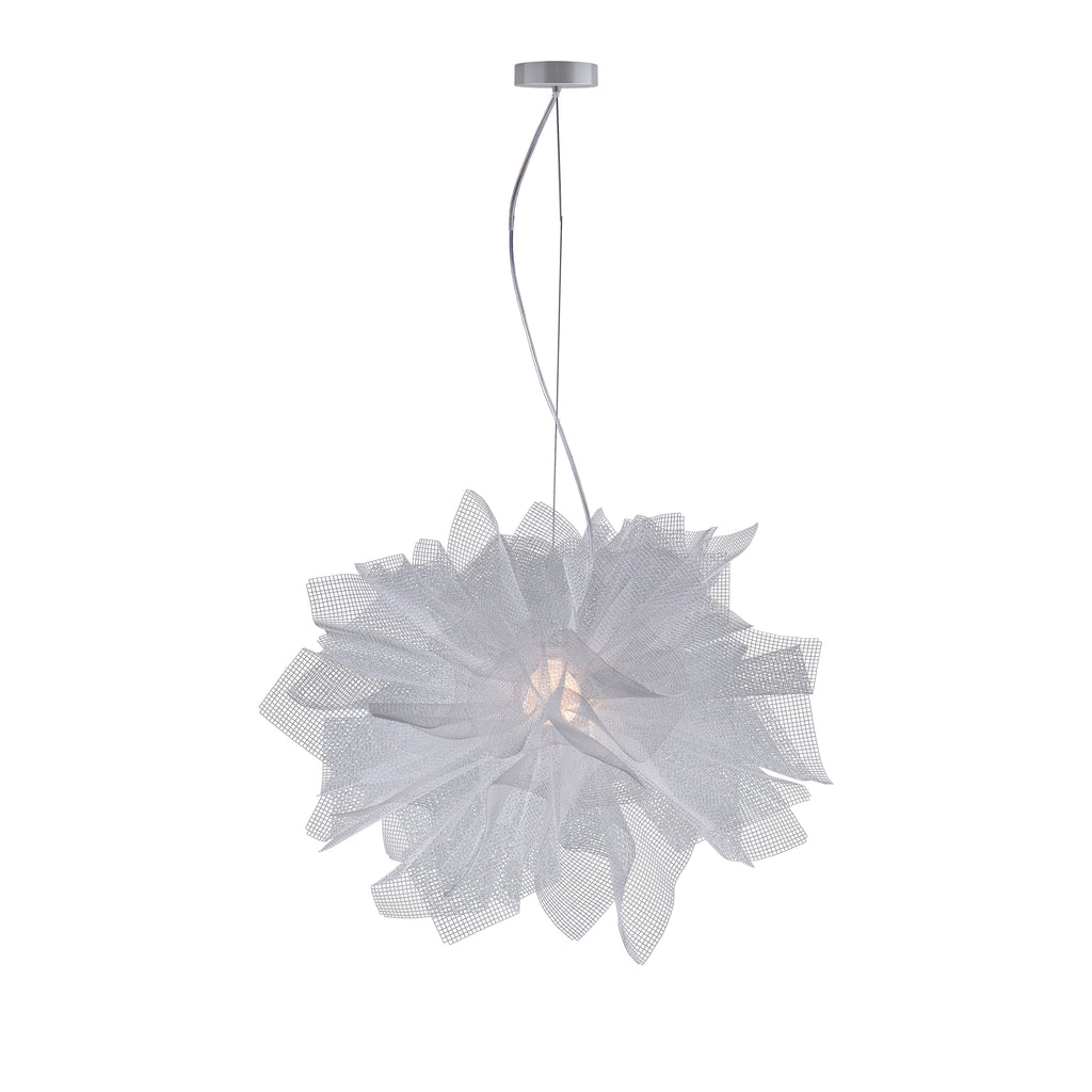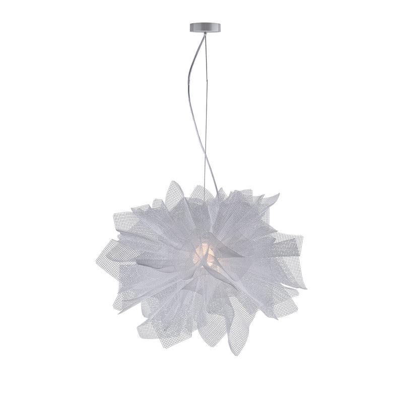 Once again, Arturo Alvarez takes the natural use of a material out of context, exploring its possibilities, achieving a surprising result. In a first approach, he begins with a cold steel thread, and plays with it, embroiling it over and over again, composing organic elements, converting it, with this gesture, in something warm. A whole universe of forms with subtle and delicate elegance, emerge from this work, with an extraordinary light escaping through them. The stainless steel, with a white finish, is a resistant and compact material that withstands the pass of time.