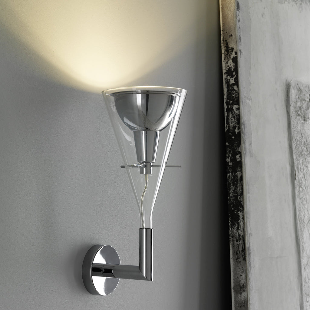 A glass cone holds the chromed aluminum reflector, supported by three slender metal rods. Equilibrium and lightness for this family of lamps available in floor and wall versions, for indirect light emission, and in a hanging version, for direct focused light.