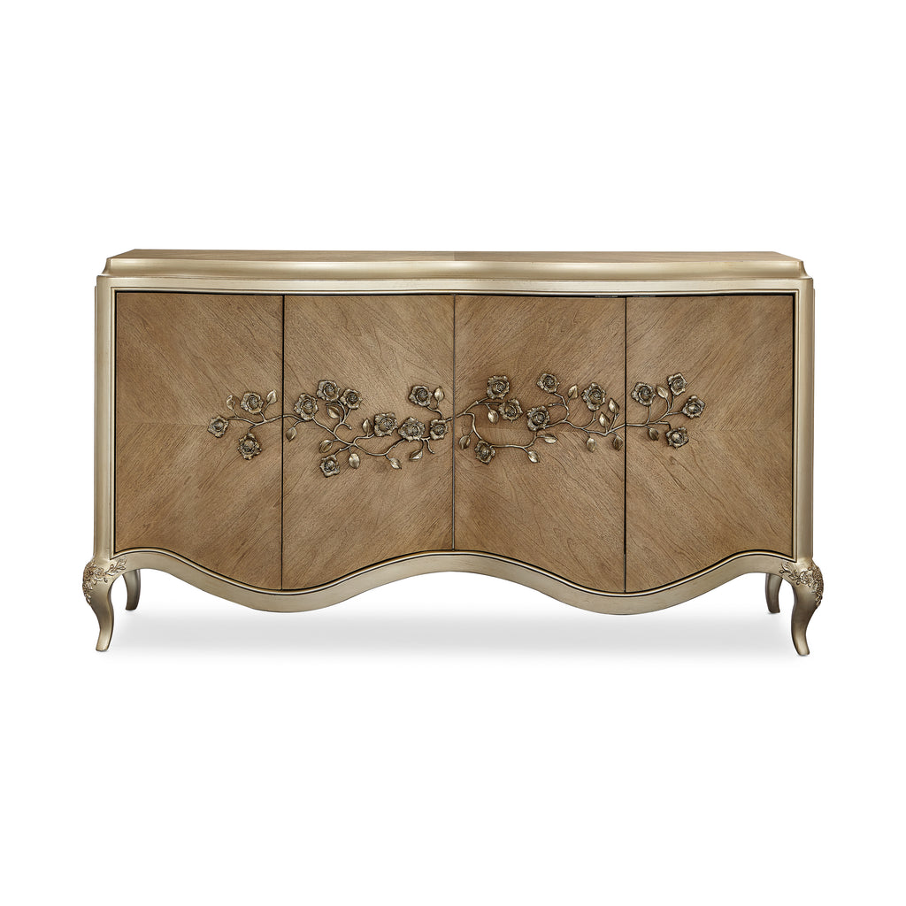 A flawless interpretation of Rococo beauty for the modern home, the Fontainebleau 4-Door Buffet from Caracole is a masterpiece of exquisite craftsmanship. This stunning buffet is defined by a sculptural metal casting of flowers and vines that gracefully flows across its shaped front, cleverly concealing the door pulls. A sophisticated trio of signature finishes—Cendre, Champagne Mist, and Aglow—highlights the buffet's classic silhouette and adds depth to its exquisite carvings and veneers. A fusion of historical grandeur and masterful design, it’s an unforgettable centerpiece for a sophisticated dining or living space.