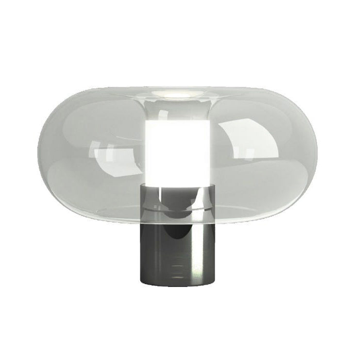 Two materials: metal and glass, as in the historic tradition of FontanaArte. The metal acts as a base and contains the light source while the glass, the true protagonist of the project, is expertly worked by skilled craftsmen in a process of fusion between a portion of transparent glass and a satin one from which the light diffuses. Fontanella is formed by the union of two glasses: the internal tube is threaded, sandblasted and finally joined with the bubble-shaped blown glass. What makes the processing particularly refined is the manual joining of the two parts, which requires the skillful technique of a craftsman. Furthermore, the glass, which has always been the material par excellence of the FontanaArte product, is the most crystalline on the market. The use of light bulbs, dimmable and not dimmable, for the biggest energy saving, complete the contemporaneity of this FontanaArte piece.
