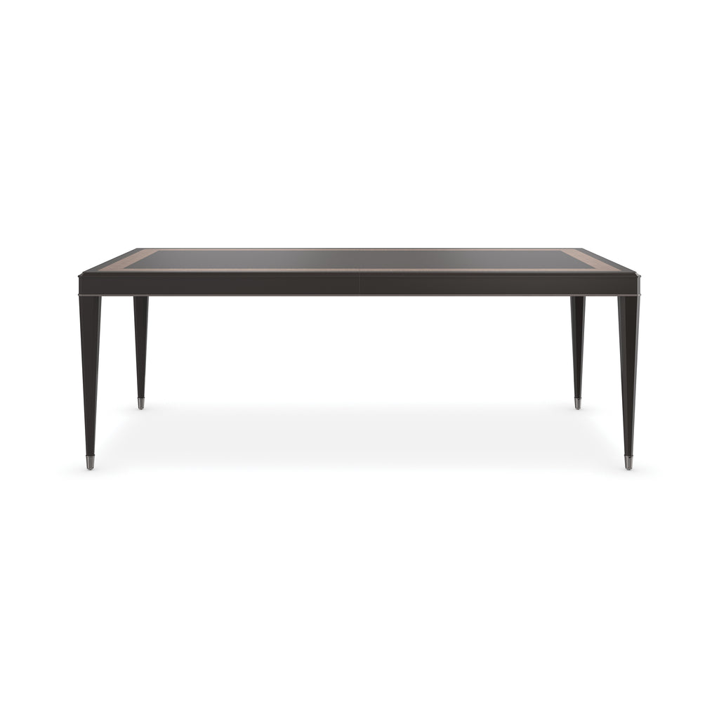 With parallel lines reminiscent of a musical staff, the Full Score Extendable Dining Table from Caracole is a stunning centerpiece designed for grand-scale entertaining. This expansive table is defined by an inlaid border of Dark Tiger Maple, which dramatically frames the top and showcases the wood's beautiful, natural figuring. A subtle stripe of Charcoal paint accentuates the corner bevel detail, extending down each leg before ending in a sophisticated Deep Bronze metal ferrule. A fusion of musical inspiration and masterful craftsmanship, it’s a timeless and unforgettable stage for your most memorable gatherings.