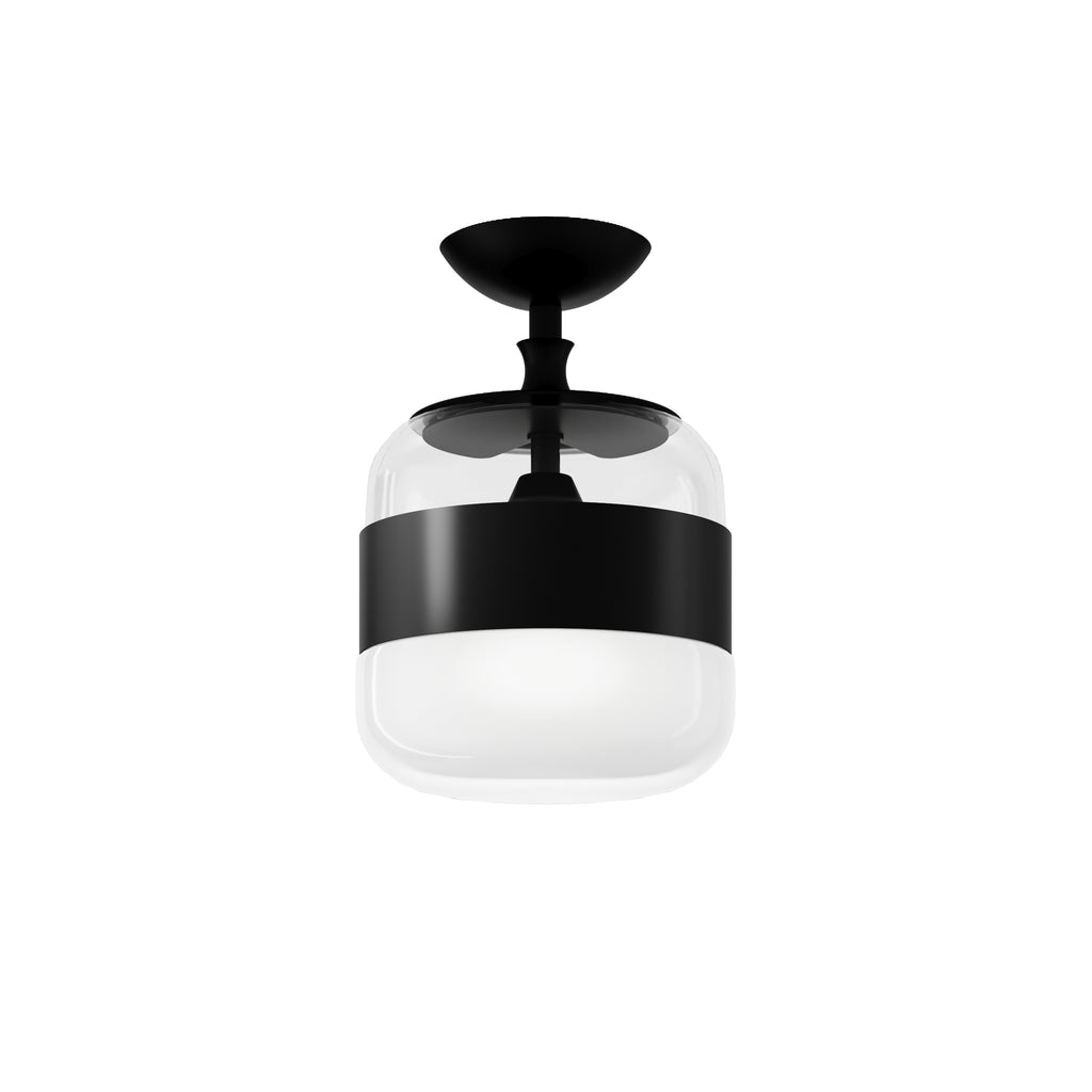 The Futura Semi-Flush Mount from Vistosi is a unique design featuring an eye-catching combination of Venetian glass and bold, formal shapes. This piece, created by Hangar Design Group, features a handblown Murano glass shade that provides a diffused light accented by a structured metal band that creates a striking contrast to the glass in any setting.