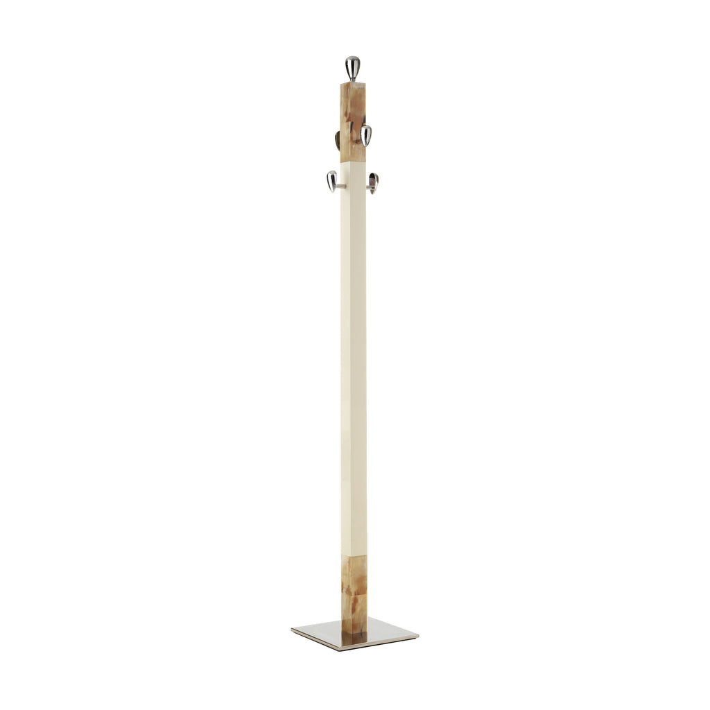 Elevate your entryway with the refined elegance of the Giglio Coat Stand from Arcahorn. Crafted with intricate manufacturing techniques, this stand features an ivory gloss wood structure adorned with luxurious dark horn tiles. Its practical design includes five hooks and a chromed brass base for ample storage of hats and coats.