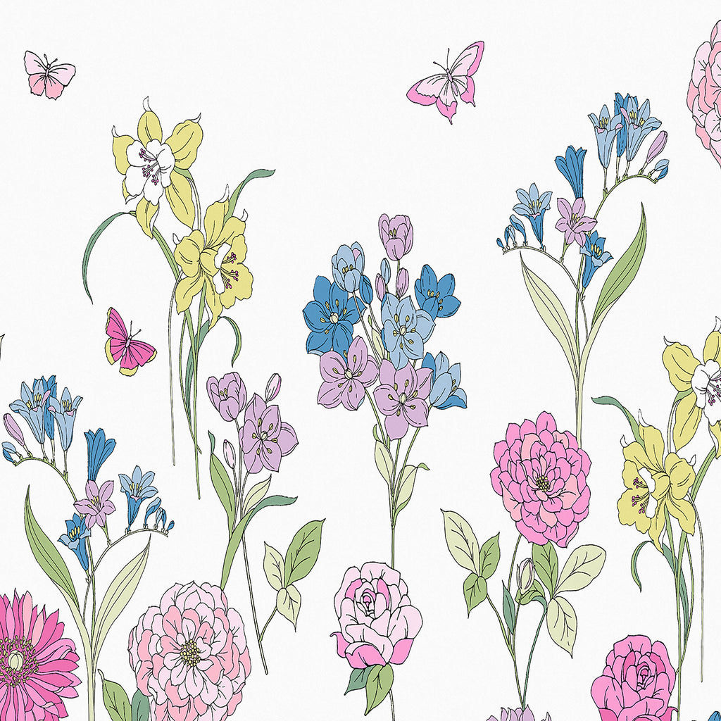 Inspired by a piece of painted artwork, this charming line drawn floral design features an abundance of stylised blooms like dahlias, daffodils and delphiniums forming a continuous pattern. Delicate butterflies perch on curling stems in this striking print. Laura Ashley murals come on one roll with 6 referenced panels.