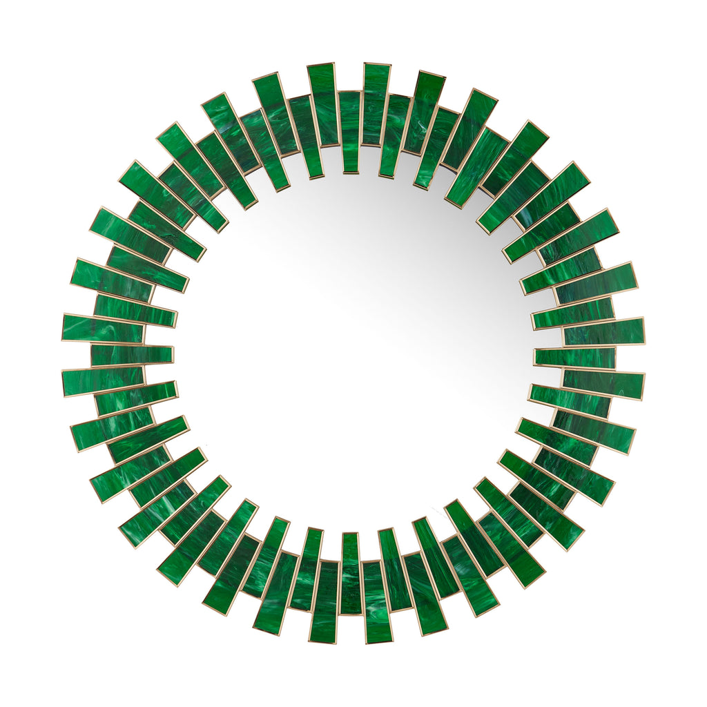 The Glasdele Round Mirror from Currey and Company is a stunning display of precision and artistry. This fixture features a radial arrangement of tapered art glass segments, each individually framed in iron with an antique brass finish. The segments fan out from the center, requiring exacting craftsmanship to ensure the glass pieces align perfectly in their uniform, sunburst-like pattern. The glass features subtle swirls that add depth and texture. Because the glass is an artisanal material, slight variations in the surface are to be expected, ensuring that every mirror is a unique work of art.