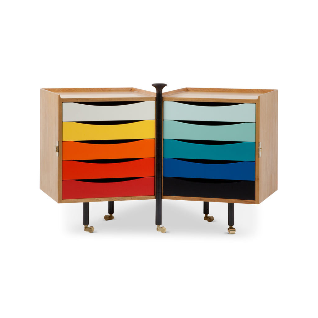 The Glove Cabinet from House of Finn Juhl, is a timeless statement piece. Made from Japanese cherrywood, it is decorated with drawers in Juhl's signature warm and cool colors, featuring burnished steel legs with stylish brass fittings and wheels, bringing sophisticated and convenient storage to any space