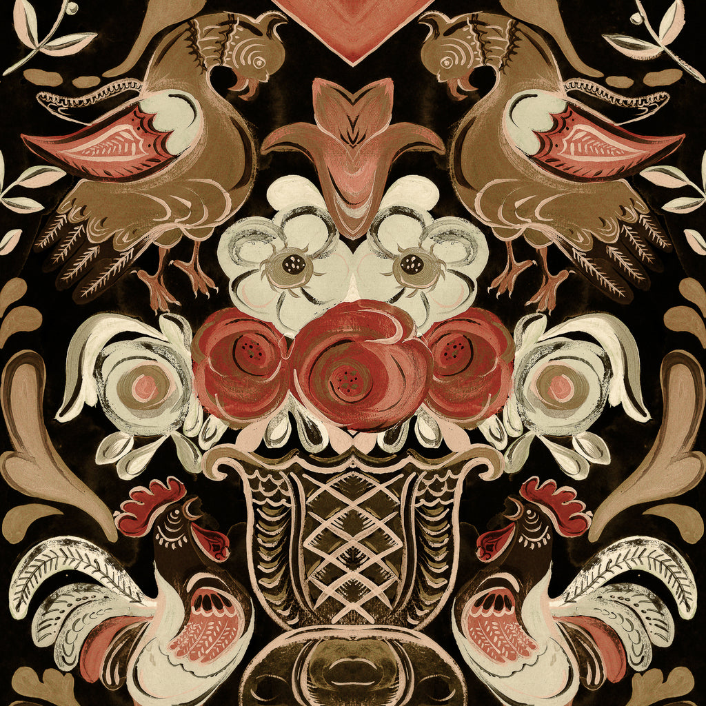 Blousy and beautiful, this exuberant folkish design brings together an imaginary golden hen with a vibrant, crowing cockerel, both of whom are paying homage to a magnificent urn bursting with impressive blooms. Inspired by traditional Tyrolean tales, this design is a celebration of a popular folk symbol depicted in gold shades that dominates GOLDEN HENNE wallpaper, while ruby red hearts are a romantic finishing touch.