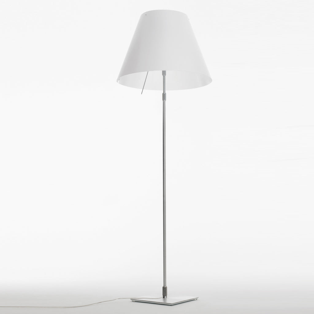 Tradition and innovation meet in this classic maxi floor model. The aluminum stem and polycarbonate lampshade enhance large spaces with lightness and luminosity for which this lamp is renowned.