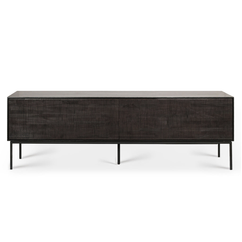 The perfect platform for resting your big screen television and other electronic equipment, the Grooves 1-Drawer Media Console from Ethnicraft brings simple, streamlined style to your well-appointed home. Crafted from solid teak with a dark finish, this media console is accented by black metal legs and hand-carved grooves, which enhances the overall character. Featuring one flip down door and one drawer, this console provides ample storage space for DVD's music, or additional entertainment equipment. Top with your favorite television and accent with framed photos and unique decor to craft the perfect entertainment space in your living room or lounge area.