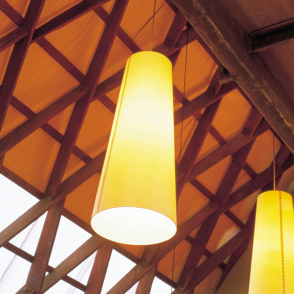 This is a large cone-shaped, woven cardboard shade to be repeated in settings where plain, warm lighting is desired. Originally designed for a famous Barcelona night bar from the 1980s, it was widely well-received and remains popular to this day, with imitations of the appearance and aspects that have failed to improve the slender, creative nature of the original.