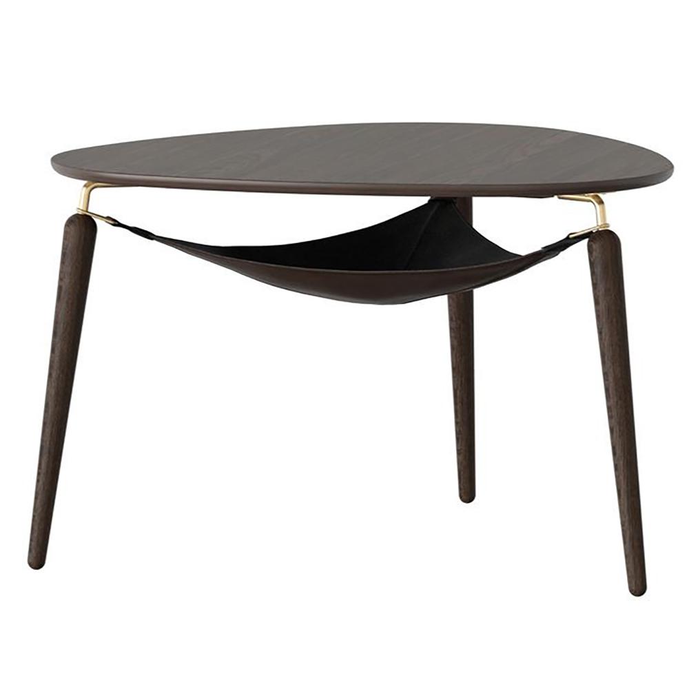 With its clean and minimal organic shape, as well as the combination of wood and fine metal details, the Hang Out coffee table has a classic Scandinavian expression. Thin graceful legs attached to a slender metal bracket and sculptured rounded table top give Hang Out a light and airy profile. Underneath the table top, a special bag is suspended across Hang Out’s three legs like a hammock. The stylish two-sided leather and textile bag is perfect for storing your remote controls, telephone, book, tablet, magazine or other smaller items. With both a leather and textile side, Hang Out’s bag can be easily swapped around to add a different expression to your interior.