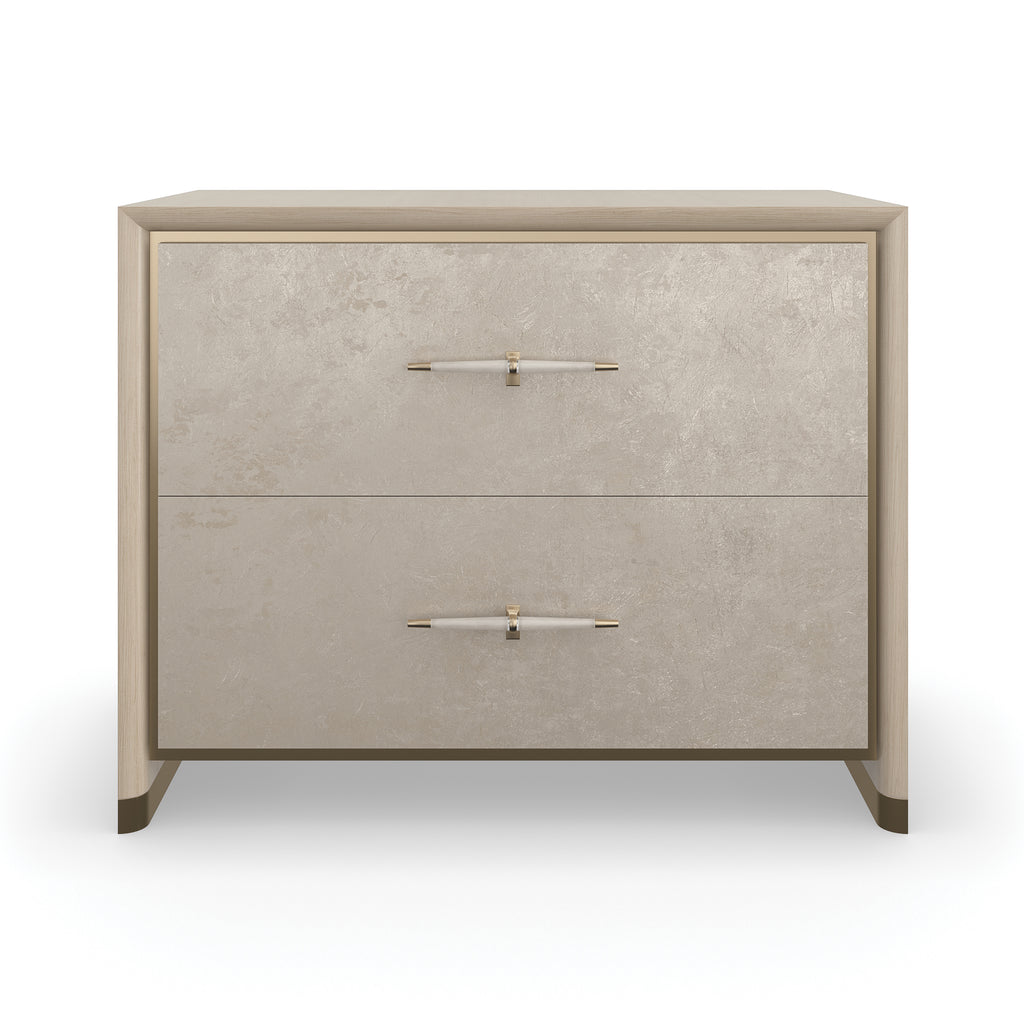Elevate your sleep space storage with the Hang Up Nightstand from Caracole. Combining the natural appeal of wood with hints of luxurious metal, this captivating bedside companion boasts soft-close drawers in a unique broken leaf metallic finish. The brushed gold accents and hand-stitched, faux leather drawer pulls add warmth and style.