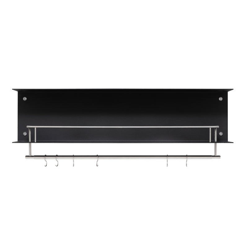 A heavy-duty kitchen shelf from Buster + Punch, this Hanger Kitchen Wall Shelf is crafted from laser-cut 0.2" sheet aluminum that has been press-bent into shape and powder-coated. This complete storage solution features a hand-polished solid metal guard rail and a separate pan rail, both finished with the brand's signature matching coin screws.
