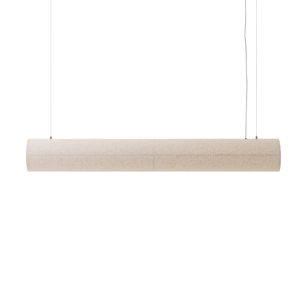 Elevate your space with the Hashira Linear Pendant Light from Audo Copenhagen. Crafted for sophistication, its horizontal design offers a fresh take on modern design, perfect over dining tables or desks. Its streamlined form is suspended by wires, while the raw linen shade, held in place by magnets, adds a clean aesthetic. With a dimmable LED light, enjoy a warm glow suitable for both productivity and relaxation.