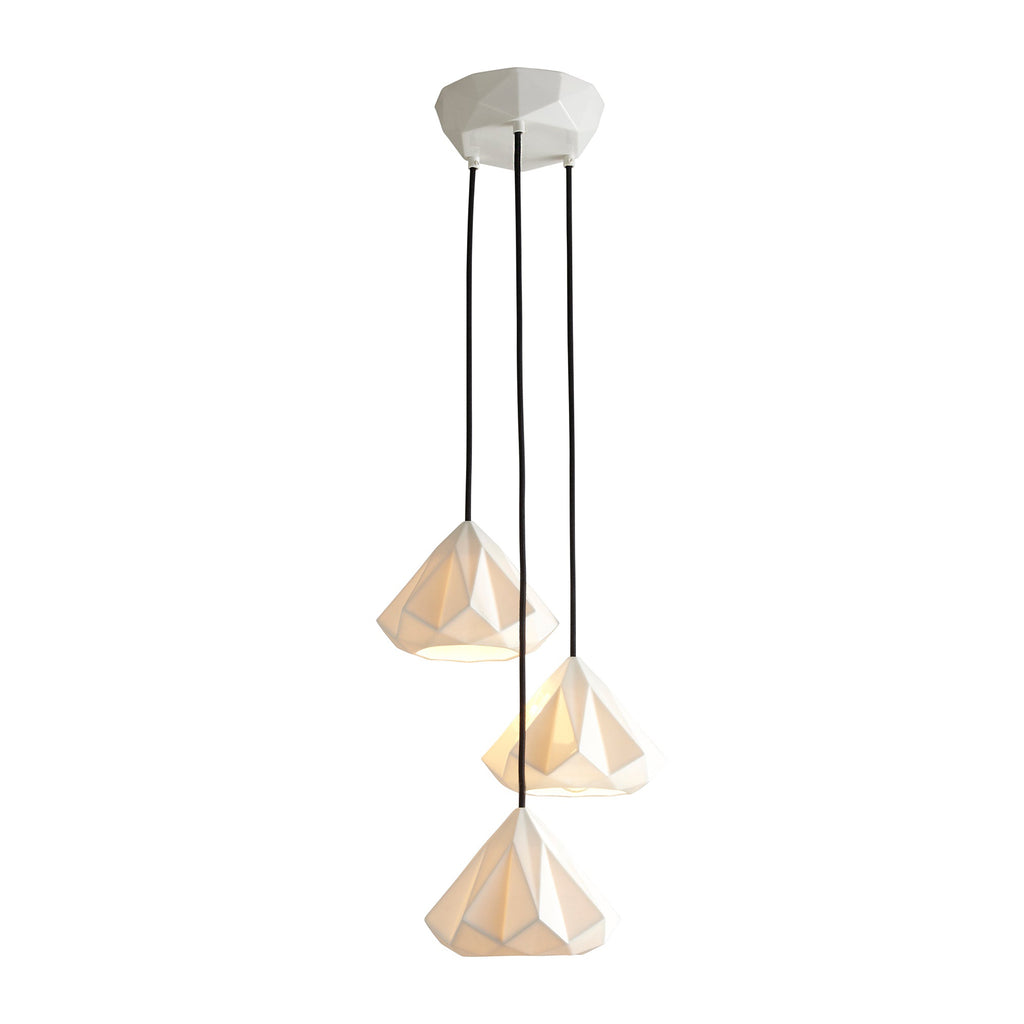 Hatton Pendant Lights have intricately beautiful bone china shades. Using highly skilled and labor intensive processes, bone china has been transformed in to multi faceted, symmetrical, gem-like forms. When switched off the lights have an angular sculptural beauty, and when switched on they provide warm, ambient lighting with dramatic lines and shadows. The lights are available in different shade designs. Each pendant has a complementing faceted bone china ceiling rose, with a contrasting black cotton braided cable, providing a contemporary edge. For a truly iconic statement piece, choose one of the Grouping of Three or Triangular Grouping styles.