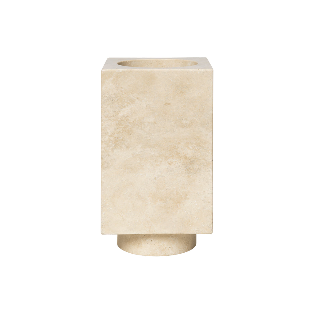 Add a touch of natural elegance to your home with the Hew Vase from Ferm Living. Crafted from solid travertine, this rectangular vase boasts a sculptural simplicity and a rounded concave center, making it a striking tabletop or shelf centerpiece. With its monolithic presence and luxurious design, it showcases the material sophistication of travertine.