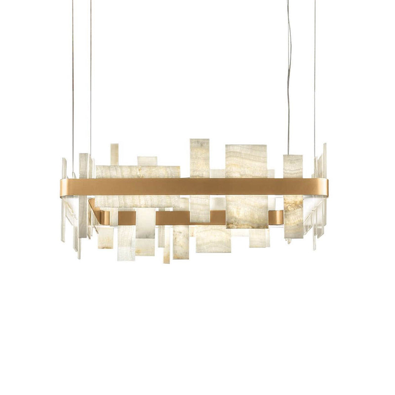 Add an instant focal point to your space with the Honice Square LED Pendant Light from Masiero. Featuring natural onyx diffusers of various sizes, skillfully attached to a gold-finished metal frame, this pendant diffuses light beautifully for a striking centerpiece. Create a stunning ambience with its elegant and versatile design, perfect for luxury spaces seeking a touch of dynamic sophistication.