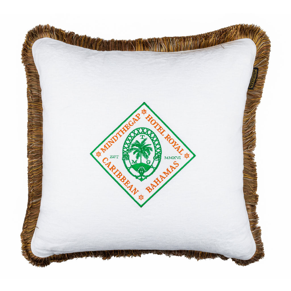 A statement cushion with a large embroidery on the front side depicting a vintage inspired sign of MINDTHEGAP’s Hotel Royal. On the back side the cushion is finished with The Jungle linen fabric. The cushion comes with golden fringing and 100% duck feathers filling.