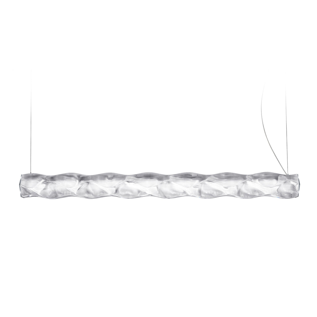 A suspension lamp that flows from one end of a space to another, hung and arranged parallel, slanted, or perpendicular to the ground. Hugo24V’s new, silky white finish is both elegant and versatile, customizing any space with its sinuous design and evenly diffused, soft light, shining through its printed techno-polymer structure. One is free to hang Hugo24V parallel to the ceiling, or create a series of the lamps to fit their desired decorative lighting design. The lamp is also available in a tenacious version made of Prisma Lentiflex® (winner of the Wallpaper Design Award), that has a flowing, liquid effect.