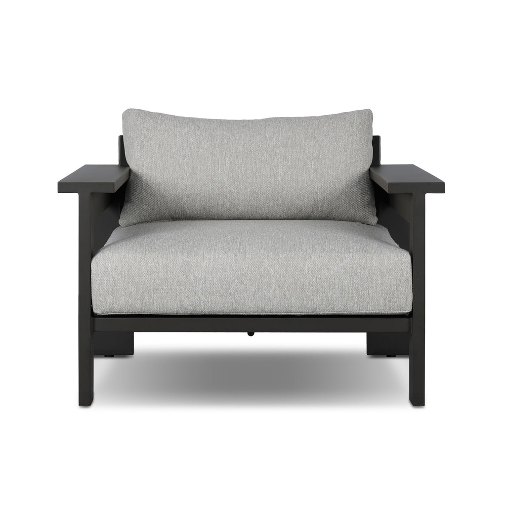 The Hyder Outdoor Lounge Chair from Four Hands brings architectural intrigue to any outdoor setting. A traditional silhouette is given a modern update with a deep bronze aluminum frame, defined by striking angular detailing for a sophisticated look. Deep, plush all-weather cushions provide inviting comfort, creating the perfect spot for solo relaxation or stylish entertaining. A statement piece on its own or paired with the matching sofa, it elevates any patio with its contemporary edge.