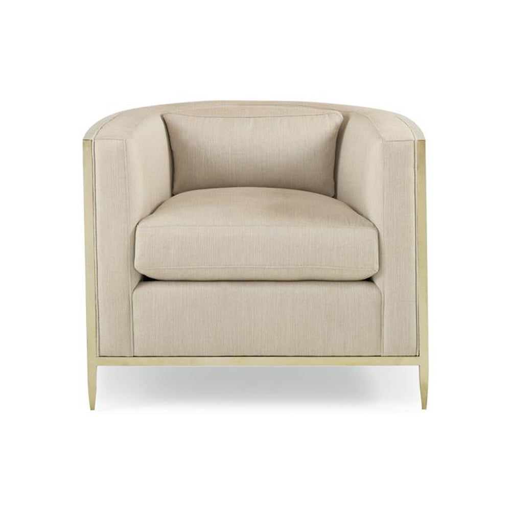 A stunning centerpiece designed to get the party started, the Ice Breaker Lounge Armchair from Caracole is a true conversation starter. This beautiful chair is defined by its custom-designed, pierced metal frame, which is expertly wrapped in a radiant Gold Bullion finish for a touch of modern glamour. Inside this beautiful metal shell, a comfortable barrel back silhouette is upholstered in a soft, off-white linen-blend fabric, featuring a subtle micro-herringbone pattern for a touch of refined texture. With a luxurious spring-down cushion and an 8-way hand-tied seat, it’s as comfortable as it is captivating. A fusion of artistic metalwork and plush comfort, the Ice Breaker is a guaranteed focal point for any sophisticated living space.