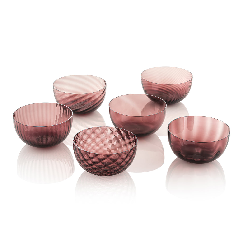 Elegant and refined, the Idra Bowl (Set of 6) from Nason Moretti adds lasting visual appeal to any tabletop. Handcrafted in Italy, these blown glass bowls each feature a different texture for a dynamic table setting that is equal parts playful and chic. Use for ice cream, salads, or appetizers, for an elevated meal, morning or night.