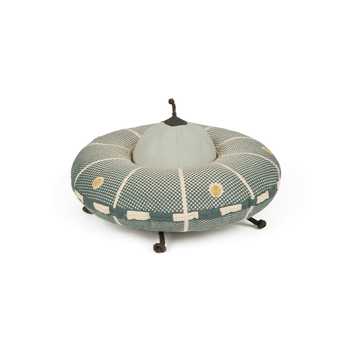 Join the intergalactic adventure with the Interactive UFO Cushion from Lorena Canals. Its innovative two-part design features a donut shape with landing leg cords and an antenna ball to connect with other planets. Crafted with natural fabric, this cushion is adorned with terrazzo green screen printing and details in blue sage, dark grey, and honey. Perfect for play or decoration. Get ready to take off into the fun!