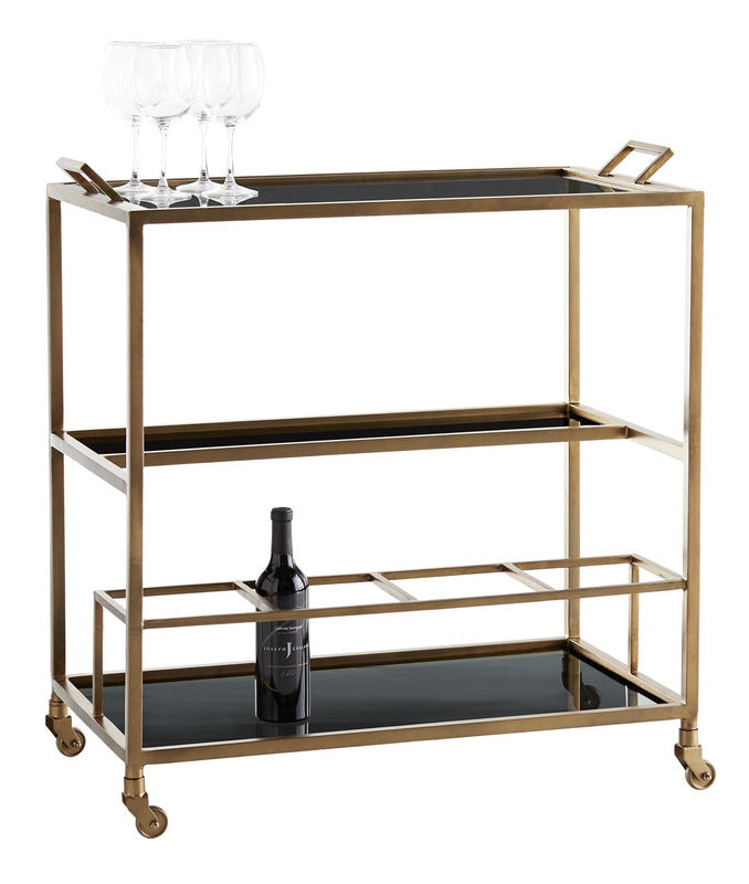 Elevate your parties with the Jak Bar Cart from Arteriors, a multi-tiered beauty that offers stylish service. Equipped with a removable black glass tray top for when you need to take the martinis on the go, its spacious, yet space-saving design will become a tasteful addition to any space.