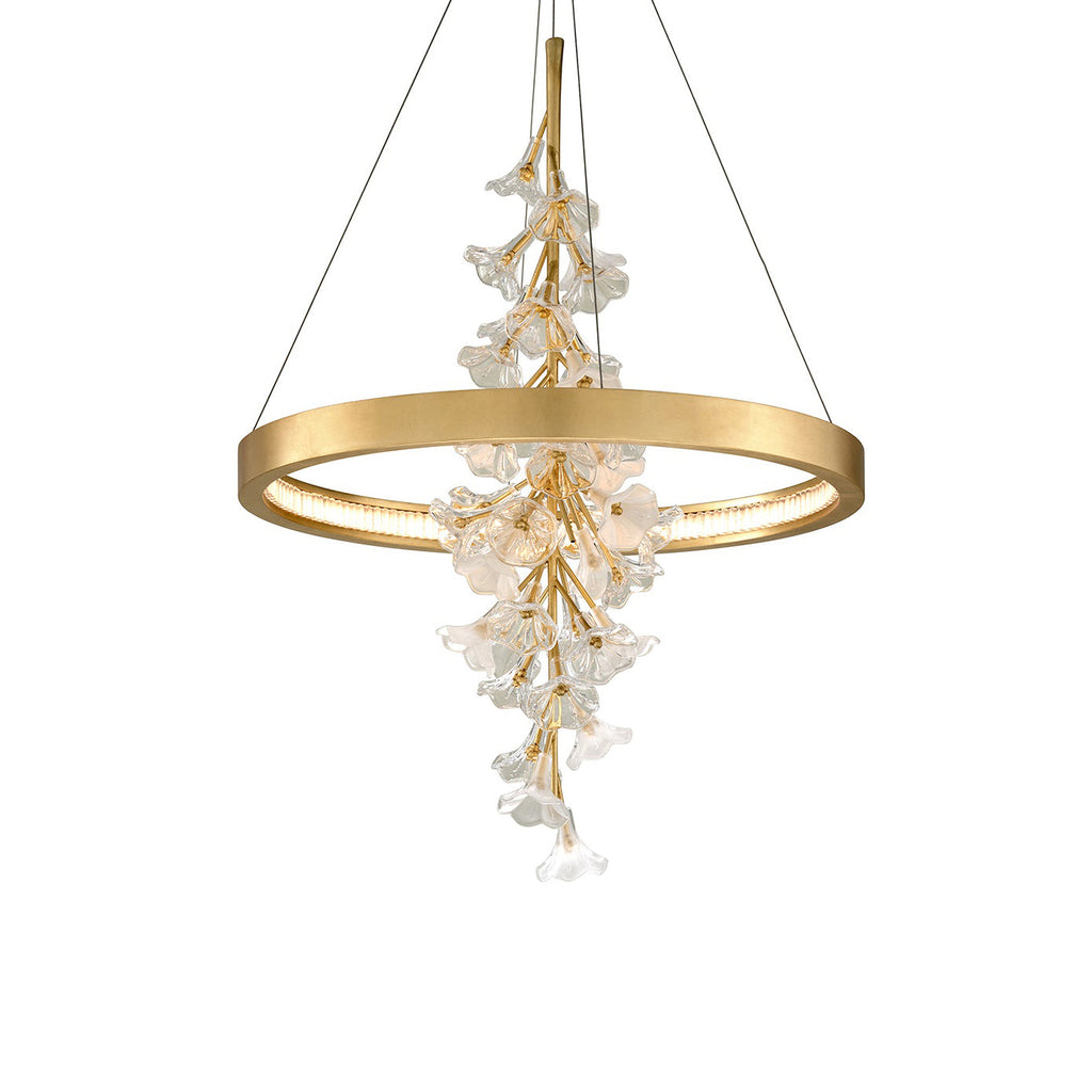 An elegant branch of metal reaches down, stemming out to support exquisite handcrafted flowers of glass, alternately translucent and frosted. Bulbs hide behind this vine in the sconces and flush mount version, shining through the glass in stunning ways. In its pendant form, this branch is suspended upside-down through a ring, lined with LED illumination along its interior. Old-world artistry and clean-lined modernism combine, in silver or gold leaf finish, for gorgeous contrast.