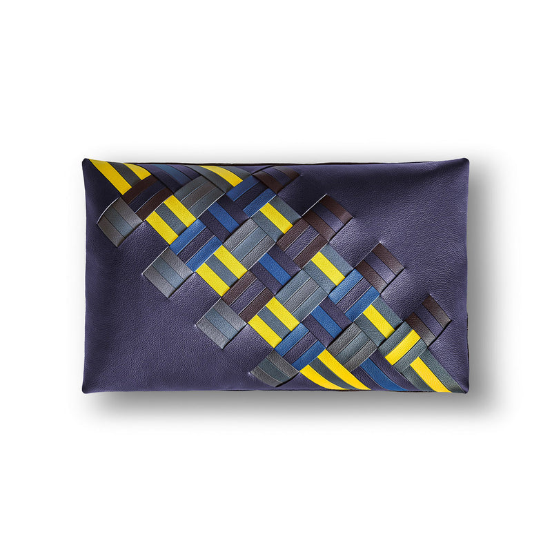 - Fronts of the cushions are distinctive for their handwoven strips which form a checkerboard motif. Every strip consists of three leather laces in progressive shades of color, two at the sides which are identical and a different color in the middle.