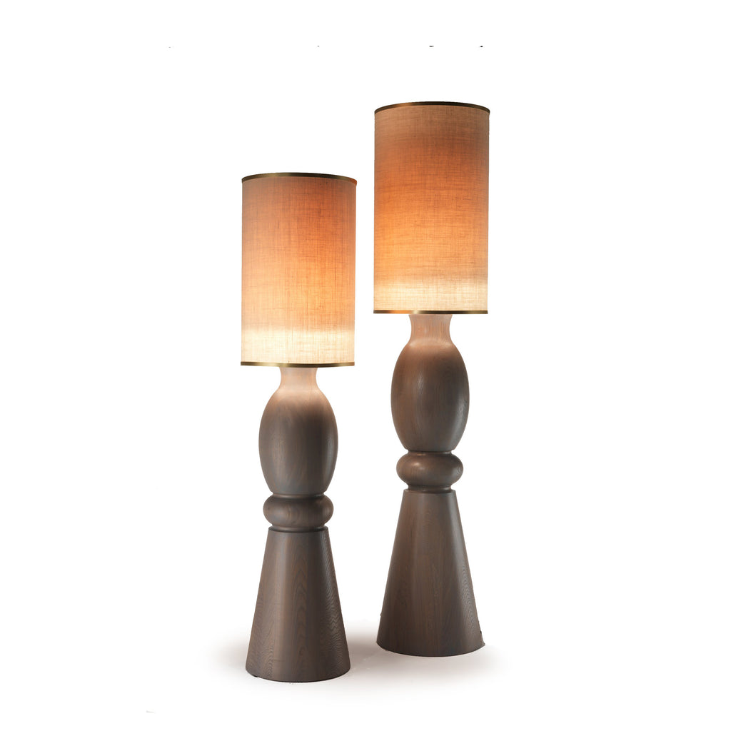 Indulge in a touch of old world charm with the Juno/Jupiter Floor Lamp from Fratelli Boffi. Its grand proportions, inspired by vintage oil lamps, exude luxury in any interior. Handcrafted from solid wood, it features an opulent opal or amber acid etched glass cap for a welcoming glow. Available with glass or fabric shades, adorned with intricate brass detailing for a final luxurious touch.