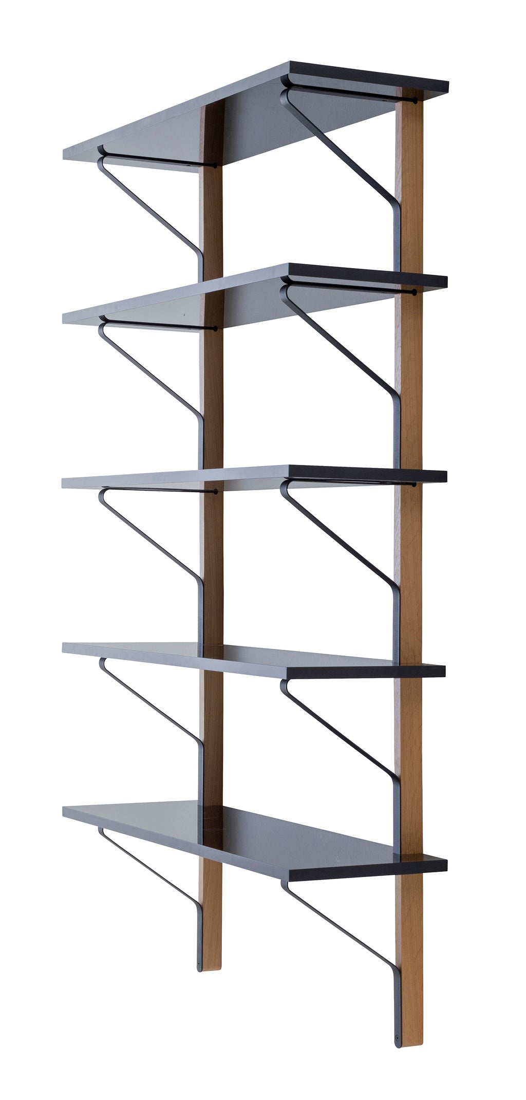 ¾" thick gloss-black melamine shelves, black ABS edges, wall bracket solid natural oak with protective varnish, powder coated black flat-rolled steel brackets.