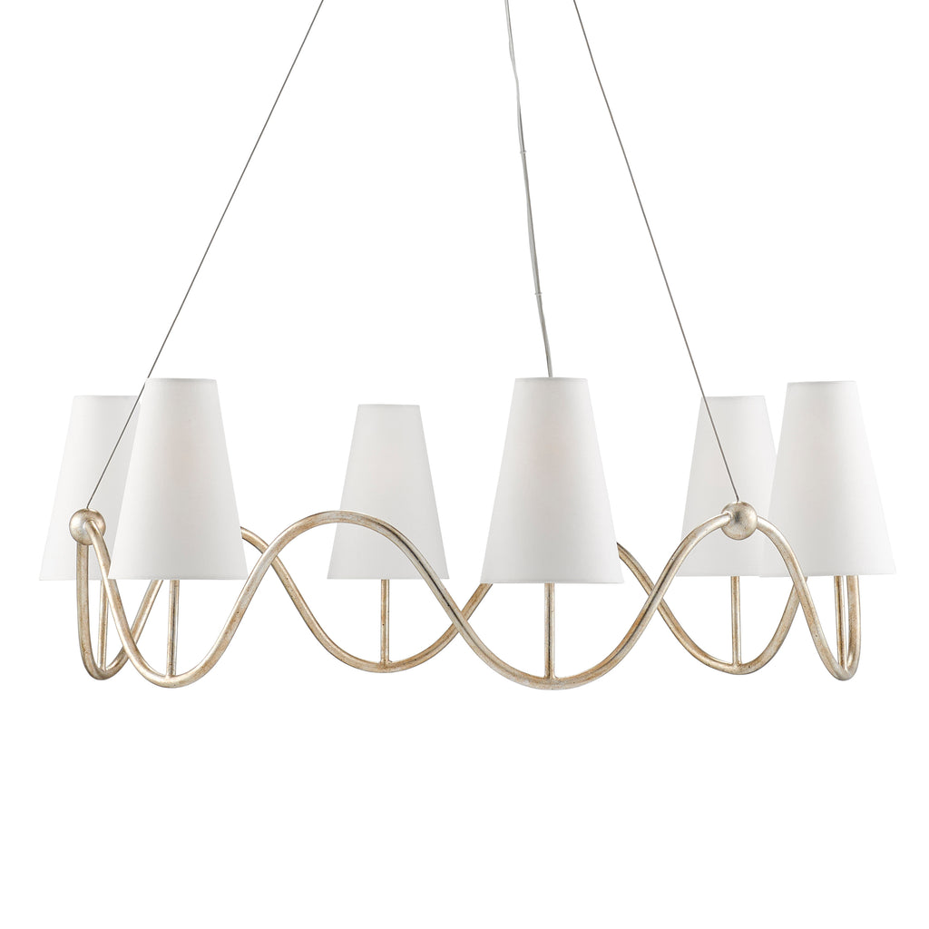 Flowing along as it is was meant to undulate above a space, the Kadir Chandelier will bring a hint of sophisticated whimsy to a room. Made of wrought iron in a silver Granello finish, the wave-like ring that holds the off-white linen shades covering the six lights is ornamented with tiny globes where the hardware meets the band. The silver chandelier illustrates the talent the artisans have for creating gleaming finishes with hints of patina.