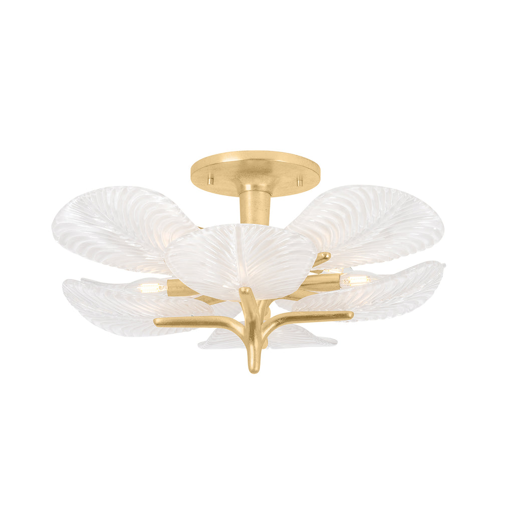 The layered botanical design of the Kamal semi-flush mount adds a pop of freshness overhead. Beautiful leaf patterns have been etched onto each piece of textured glass, creating a dynamic wave-like outward diffusion of light. The candelabra cluster positioned just beneath the ceiling canopy casts light through the layers to create a warm glow around the room. Kamal makes a fresh statement in hallways, bedrooms, and beyond.