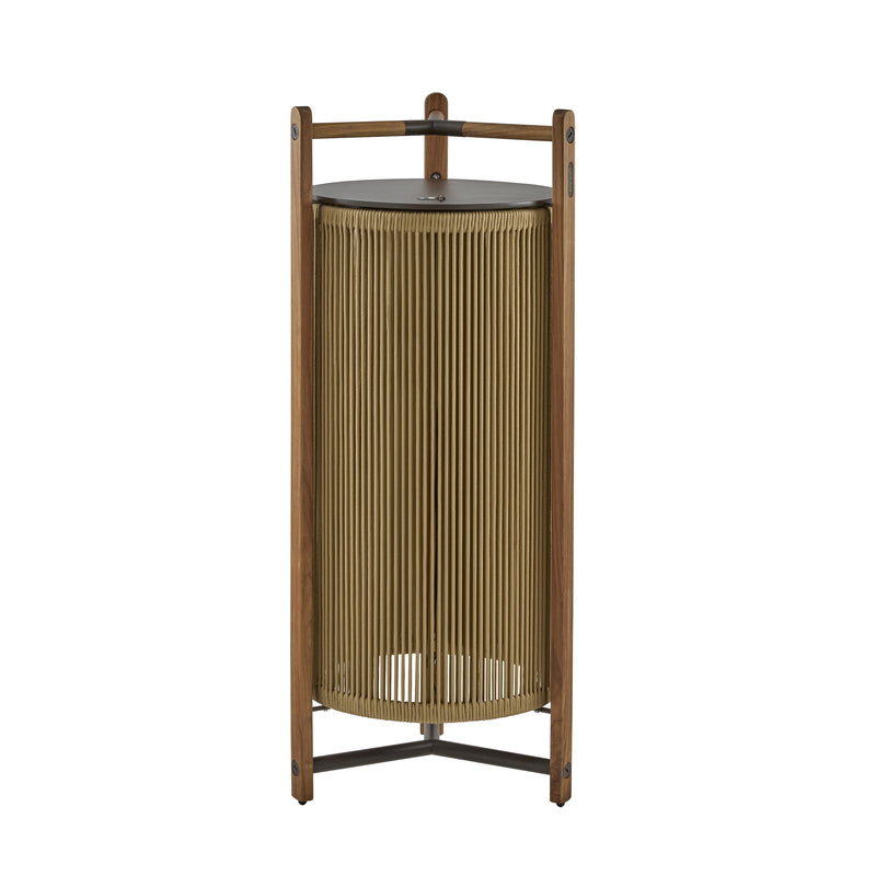 Elevate your outdoor space with the Kando Outdoor Portable LED Floor Lamp from Bover. Crafted with teak wood and aluminum, this versatile fixture exudes contemporary elegance. The nautical cord shade encases an LED light source, providing soft, ambient illumination. Perfect for patios or backyards, this is a must-have for enhancing your outdoor lighting in a transitional style.