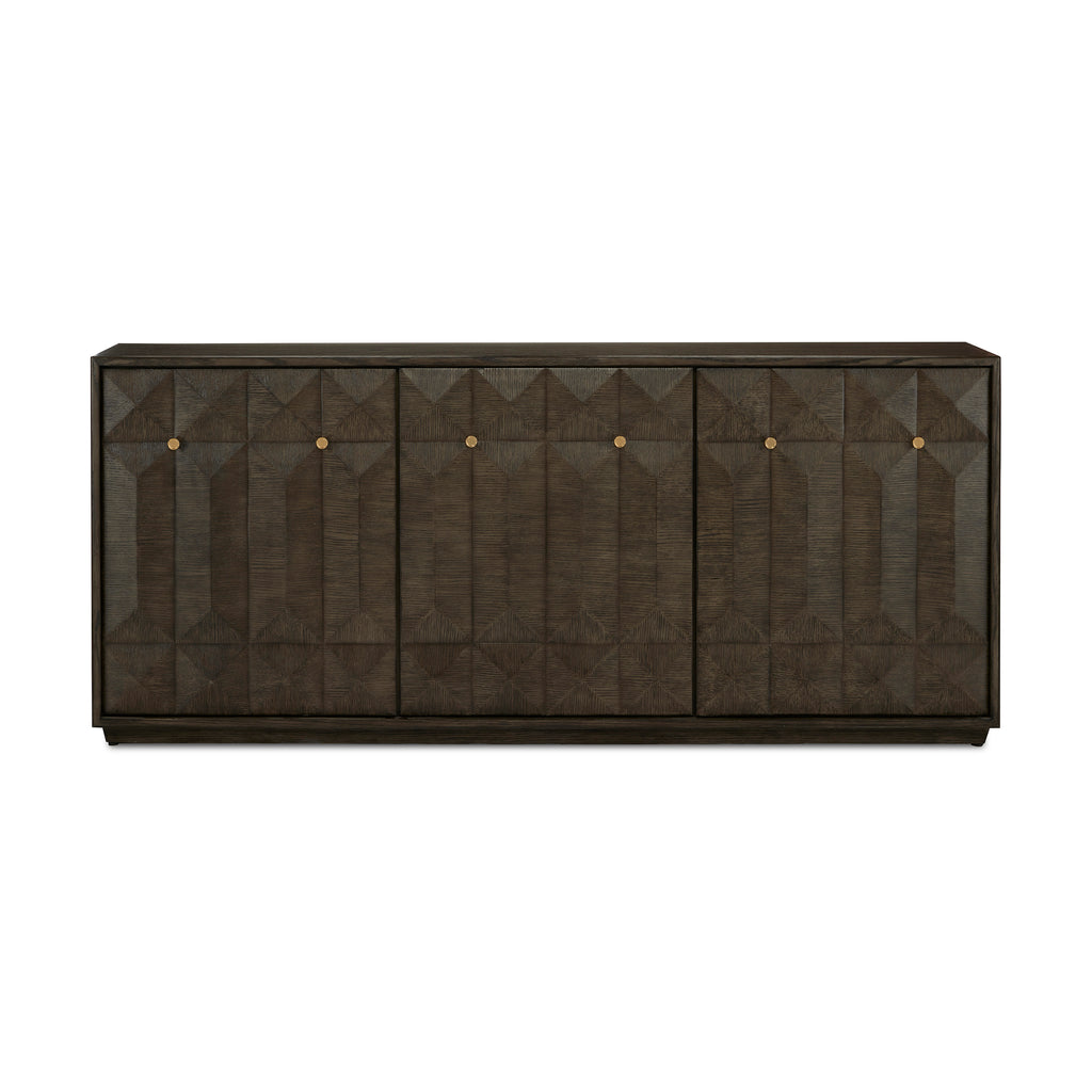 Add a touch of modern elegance to your space with the Kendall Credenza from Currey & Company. Its contemporary design and geometrically detailed facade bring a sophisticated touch to any room. Featuring discreet pulls and a combination of oak solids and veneers with brass accents, this credenza exudes quality and style. Use it for storage or as a statement piece to enliven your decor.