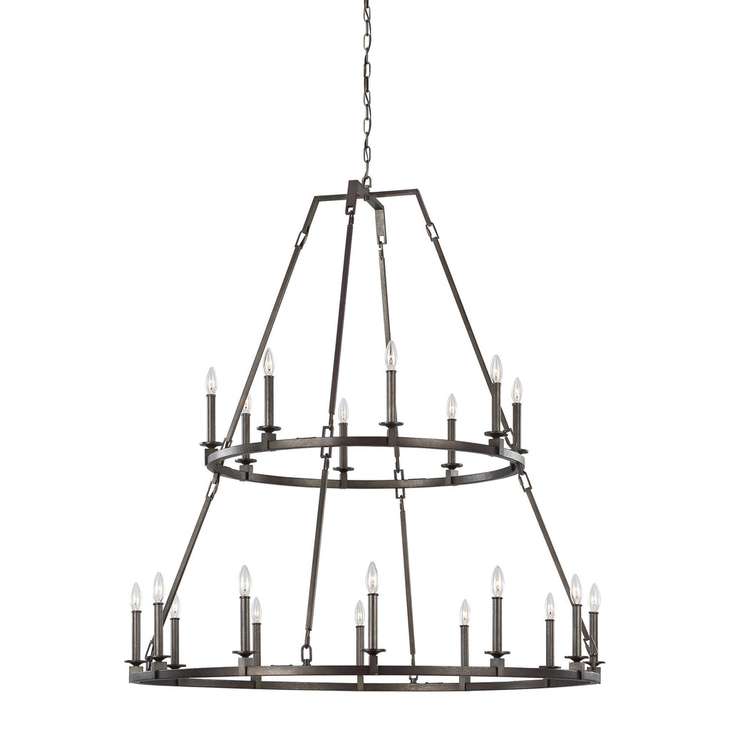 The Sean Lavin Landen Two-Tier Chandelier is a grand, industrial-style addition to a home. Its two-tier structure has a rectangular crown as well as rectangular block details under each light socket. The entire fixture is about 40” high and can hold 12 or 20 lights, illuminating even the most spacious of rooms. A sturdy, rugged chain suspends the two-tier chandelier.