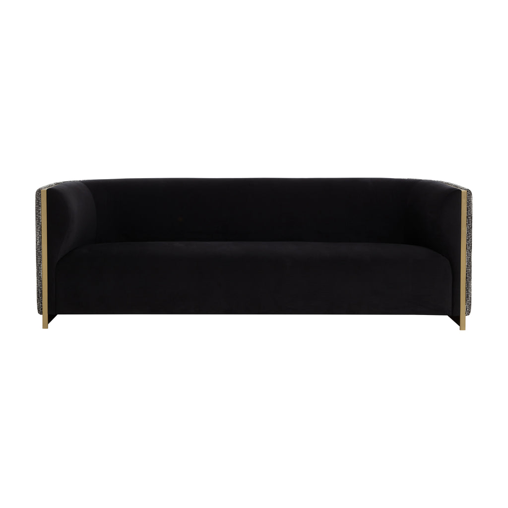 Discover ultimate luxury with the Larron Sofa from Sunpan. With a contemporary mix of materials, this two-tone sofa is upholstered in contrasting abbington black and hobbes night fabrics for a sophisticated touch. Gold stainless steel accents and foam-filled cushions provide comfort and durability for hours of entertainment or relaxation. Expertly crafted for timeless elegance, this sofa is the perfect accent piece in a lounge space, living room, or entertainment area.