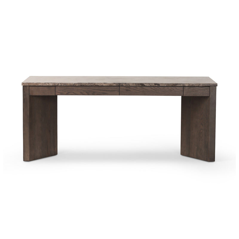 The Lawson Desk from Four Hands elevates the traditional writing desk with a stunning combination of materials. The vein-rich marble top rests upon an angular brown oak base, providing a luxurious and sophisticated workspace. Two spacious pencil drawers offer storage, making this desk both stylish and functional.