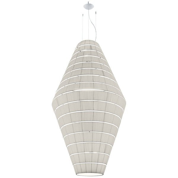 Layers is a collection of suspension lamps with a strong sculptural presence, obtained through combinations of different geometric shapes. Its layered system is modular, which allows you to create different shapes. The distinctive feature of Layers is the breadth of its volumes, but at the same time its lightness, which make this lamp ideal for large spaces. The texture of its fabric and the structure of Layers, as demonstrated by our tests, allow to reduce noise by up to 47%. Being able to count on an Equivalent Absorption Area that reaches a maximum of 5.78, Layers is a sound-absorbing lamp with remarkable performance.