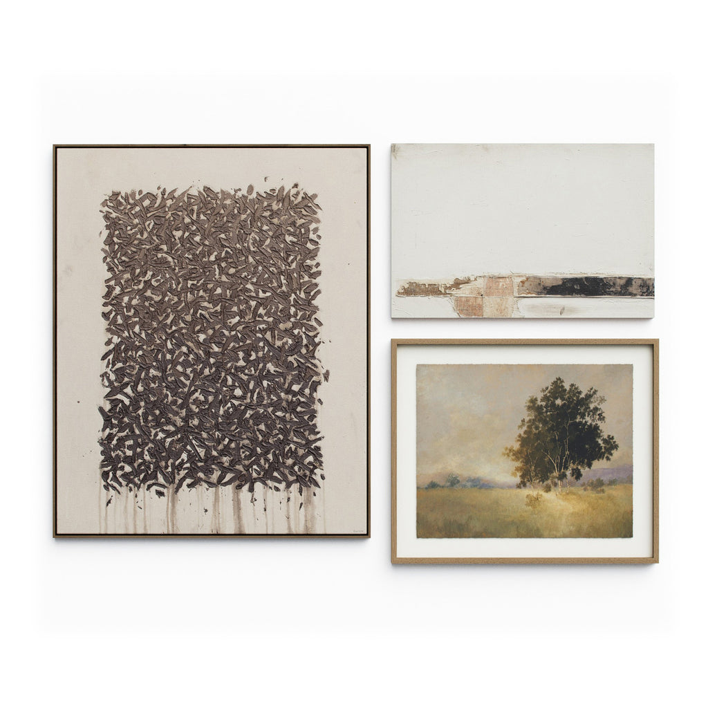 Craft the look of a collected gallery wall with this complementary set of three art pieces from Four Hands. "Layers of Time" includes "Tender Provisions" by Tyler Guinn, "We Woke to a Dream" by Aileen Fitzgerald, and "Gneiss" by Paul Meyer, all handmade in Austin, Texas.