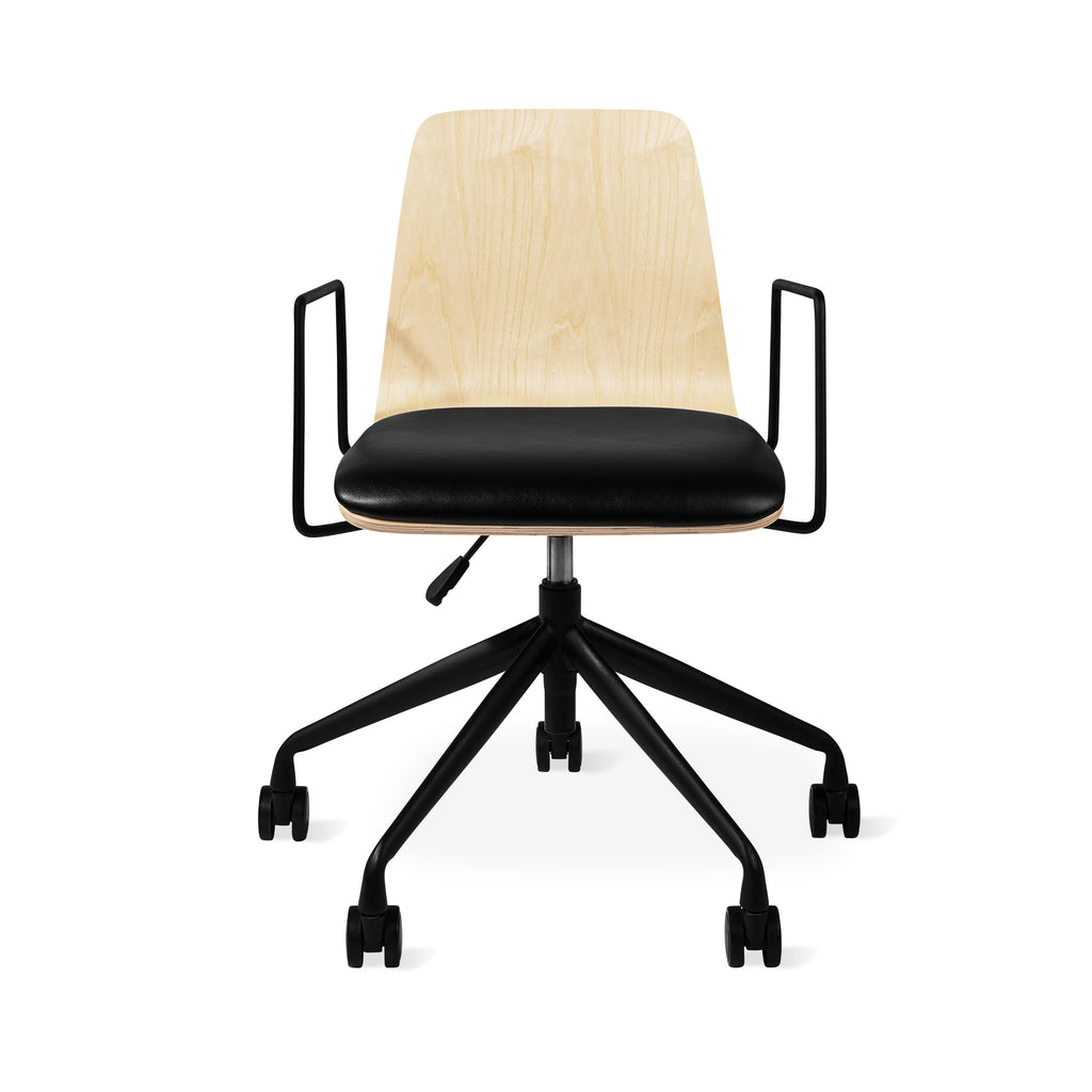 Elevate your workspace productivity with the Lecture Task Chair from Gus. Its lightweight, formed-plywood design provides both style and ergonomic support with a padded seat cushion and curved back. Effortlessly adjust its height with the lever and swivel to see your work from a new perspective. Stable and modern, this chair is a must-have for any desk or table.