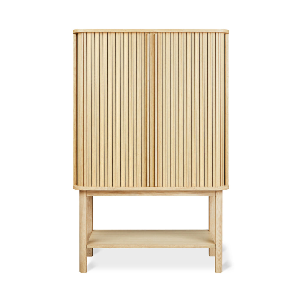 Transform your space into an organized haven with the Ledger Tall Cabinet from Gus. Its sleek tambour wood sliding doors effortlessly reveal or conceal clutter, while its elegant proportions and exquisite craftsmanship add sophistication to any room. The perfect balance of form and function, featuring eco-friendly materials and a timeless design, this cabinet is perfect for living rooms, kitchens, and bedrooms alike.