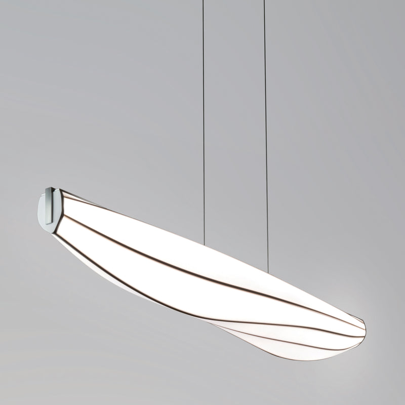 Cerno’s Lenis LED Linear Pendant features the beauty of fluid, organic movement, inspired by the humble experience of building a sailboat. Designed by Nick Sheridan and handmade, wood stringers are bent across white fabric to create a peaceful fluidity to this pendant. Ideal for modern kitchens, dining rooms, living rooms, and offices, geometric inspiration and sculptural form come together as one in this contemporary piece.