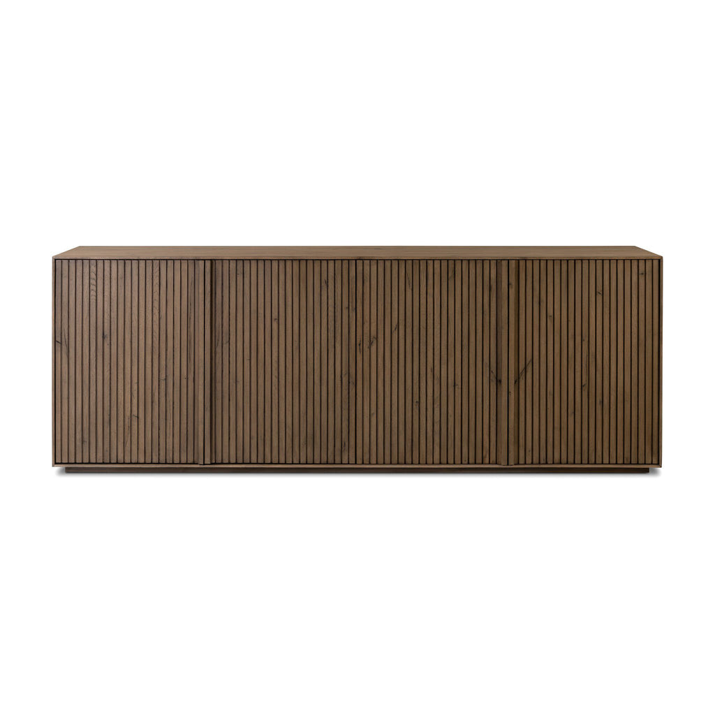 Introduce a touch of midcentury elegance to your home with the Leo Sideboard from Four Hands. Crafted from rustic-finished oak, this piece features clean angles and linear reeding for a sleek and sophisticated look. With a fully finished interior, the sideboard is as beautiful on the inside as it is on the outside, offering ample storage space for daily essentials, decor, serveware and more.