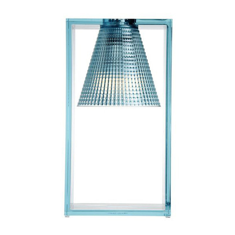 Light-Air, the "illusionist" table lamp, defies the laws of gravity with its suspended light and offers both practicality and aesthetics. Light-Air is basic, modern and rational, yet at the same time produces a magical effect. The structure of the table model lends it a strong character. The new version is composed of a rectangular frame in transparent or through-colored engineering thermoplastic, housing a gold conical shade and a sculptured diffuser in the same plastic material. Alongside this model is a pendant version: transparent and entirely crystal-colored with a sculptured shade or conical diffuser covered in plissé.